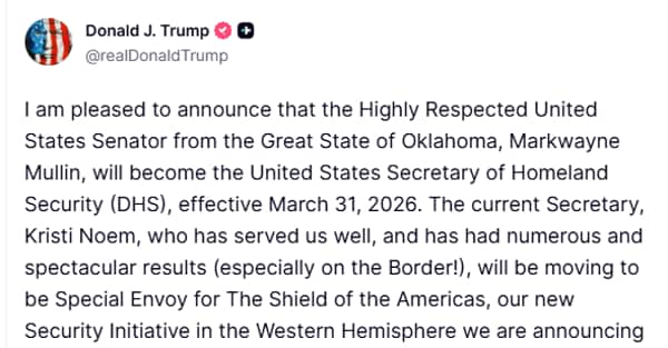 I’m happy to announce that United States Senator, Markwayne Mullin, of the extremely esteemed Great State of Oklahoma, will change into the United States Secretary of Homeland Security (DHS), efficient March 31, 2026. Current Secretary, Kristi Noem, who has served us effectively and has achieved many spectacular accomplishments (particularly on the border!), will change into Special Envoy for The Shield of the Americas, our new Western Hemisphere Security Initiative we’ll announce Saturday in Doral, Florida.