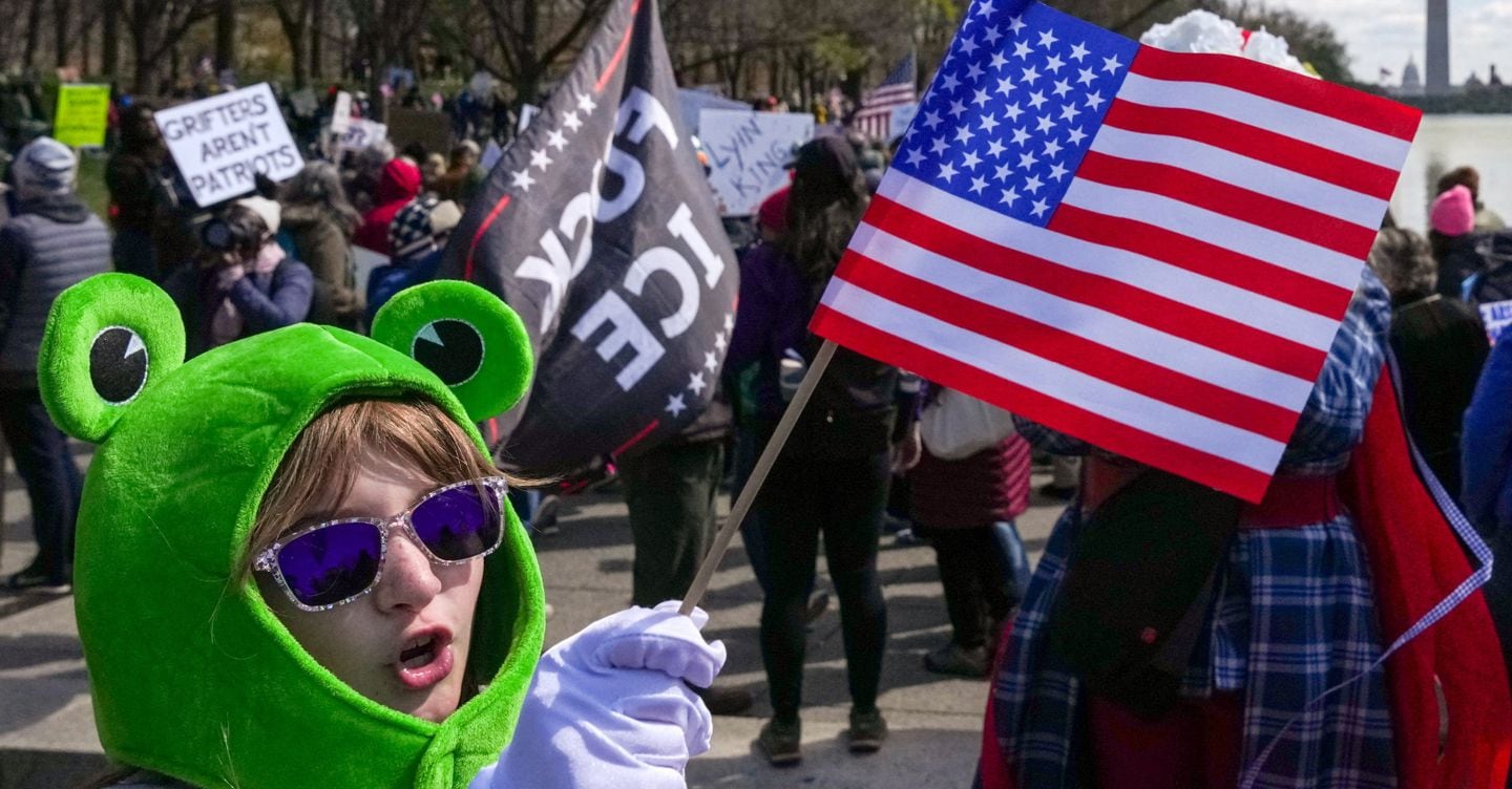 Trump’s immigration management coverage, notably in Minnesota, was simply considered one of many causes for protest, together with the warfare in Iran and the discount of transgender rights. Speakers additionally criticized the financial energy of billionaires. TO Washingtontons of of individuals they marched from the Lincoln Memorial to the National Mall with indicators like “Lay down your crown, clown” and “Regime change starts at home.” Bill Jarcho, who flew in from Seattle, was accompanied by six folks dressed as bugs in tactical vests emblazoned with “LICE” — a parody of ICE — on what he known as a tour of “teasing and shock.”